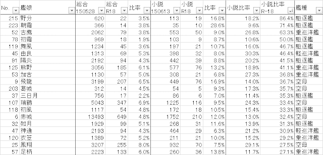 R-18小説の数だけでソート。比率ではないので、古くから実装されている艦が上に来やすい。